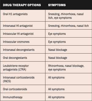 Intranasal corticosteroid (INCS) is the first-line treatment for moderate/severe intermittent and persistent AR. These medications are used once- or twice-daily in each nostril and good technique is essential and should be checked at every opportunity. If the nasal cavity is very obstructed, a nasal spray may not be effective. Nasal drops may be more effective in this scenario. Nasal spray technique can be viewed online via Asthma + Lung UK at www.youtube.com/watch?v=S31maomo1xQ. The efficacy of INCS is not improved when used with oral corticosteroids (OCS).