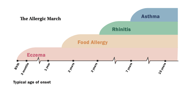 Figure 3 illustrates the typical age of onset of allergies in children. Outdoor allergens are unusual in children under two years of age. Type 2 sub-endotype IL4/IL-13 is associated with AR in children. IL-5 is associated with asthma.