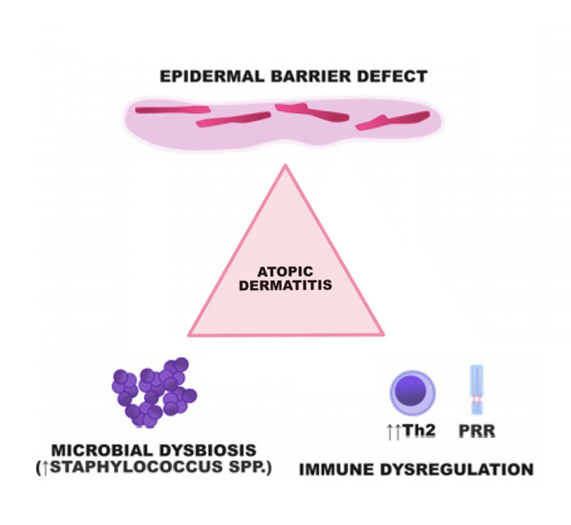 3. Microbial dysbiosis patients with AD demonstrate altered skin microbiomes, with increased colonisation by Staphylococcus aureus (S aureus) and decreased microbial diversity. This dysbiosis contributes to inflammation and barrier dysfunction through the production of bacterial toxins and proteases.