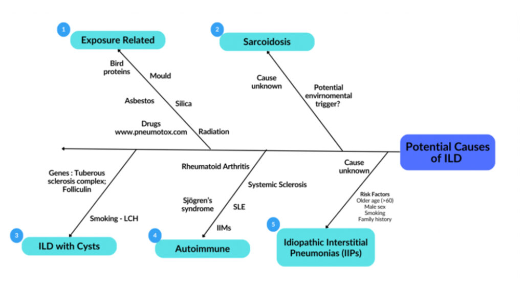 A critical aspect of diagnosing an ILD begins with a thorough clinical history and physical examination. Patients typically report progressive shortness of breath, which is initially noticeable on exertion and a chronic non-productive cough. Given the wide differential and heterogeneity in subtypes of ILDs, it is important to take a thorough history of potential aetiologies for the underlying ILD including exposures, occupations, medication history, family history of ILDs and features of CTD (Figure 2). Physical examination typically reveals finger clubbing and fine inspiratory crackles on auscultation of the lungs. Additional clinical signs may be observed depending on the underlying aetiology. Examples include signs indicative of an underlying CTD such as sclerodactyly, telangiectasia, skin puckering around the mouth and a photosensitivity rash. Similarly, skin thickening may be observed in systemic sclerosis, as well as rheumatoid nodules in rheumatoid arthritis (RA). An in-depth history and examination provide vital information to diagnose and subsequently subtype the ILD. This then aids management and provides valuable information on prognosis. It is for this reason that the power of history and examination should not be underestimated and should be completed to a high standard. Due to the non-specific nature of early symptoms and physical examination findings, diagnosis is often delayed by several months, with the average case being diagnosed after 12 months. As previously discussed, conditions such as COPD are frequently considered, or even misdiagnosed, prior to an accurate identification of an ILD.
