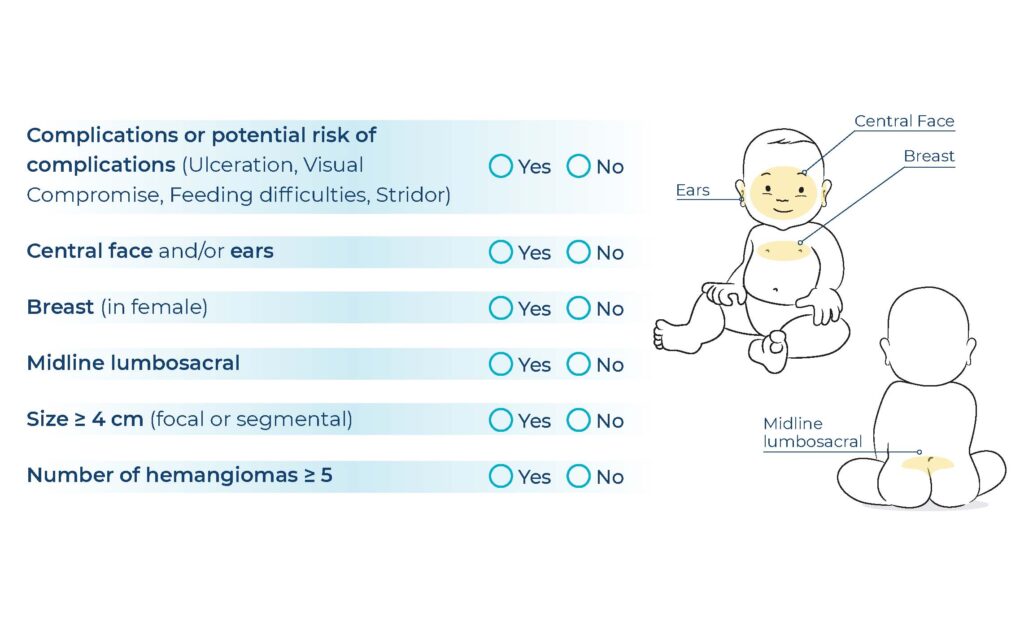 The decision of whether or not to refer a patient with an IH to a specialist centre can be a difficult one. By default, the patients are infants and because of their appearance, haemangiomas can often cause significant parental anxiety. In 2019, a useful scoring system to aid physicians with this decision was designed and validated. The Infantile Haemangioma Referral Score (IHReS) is a simple, six-question scoring system, which is available as a handy online tool (Figure 2). The six questions refer to location, size, and number of haemangiomas. If the answer to any of the six questions is yes, then, quite simply, the patient should be referred. If all the answers are no, there are some follow-up questions regarding size of the IH and age of the patient.