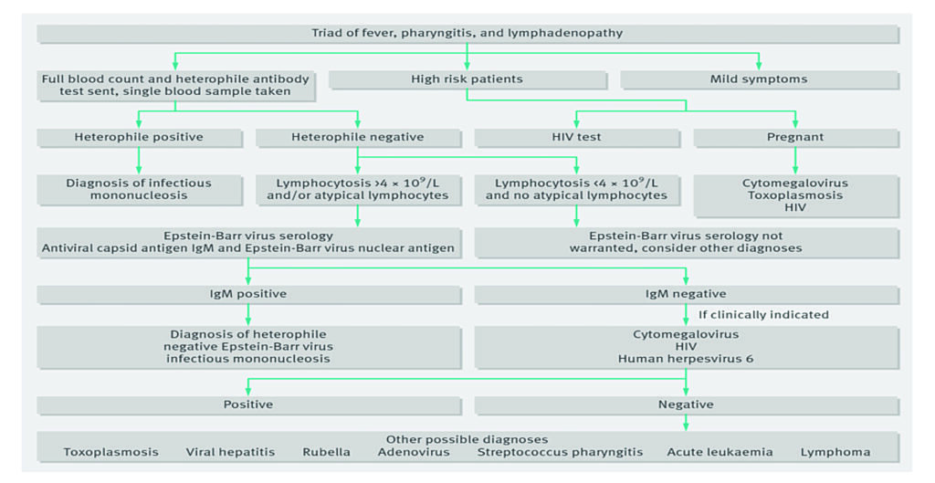 Infectious mononucleosis should be suspected in patients who present clinically with the classic triad of fever, pharyngitis, and cervical lymphadenopathy. Lymphadenopathy may be prominent in both the anterior and posterior triangles of the neck, which distinguishes infectious mononucleosis from bacterial tonsillitis where the lymphadenopathy is usually limited to the upper anterior cervical chain. Other common physical signs include palatal petechiae, splenomegaly, hepatomegaly, and jaundice. Diagnosis of infectious mononucleosis is primarily based on symptoms, but should be confirmed by the heterophile antibody monospot test. Sensitivity is 85 per cent and specificity is 100 per cent. The heterophile antibody monospot test results may be negative early in the course of EBV infectious mononucleosis.