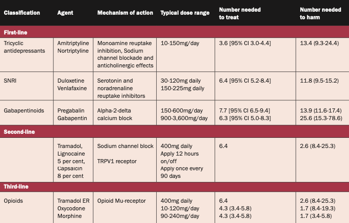 The Neuropathic Pain Special Interest Group (NeuPSIG) of the IASP conducted a systematic review of randomised double-blind studies of oral and topical pharmacotherapy for neuropathic pain, including unpublished trials (retrieved from clinicaltrials.gov and pharmaceutical websites). Meta-analysis used numbers needed to treat (NNT) for 50 per cent pain relief as the primary measure and assessed publication bias. Table 1 highlight the key aspects.