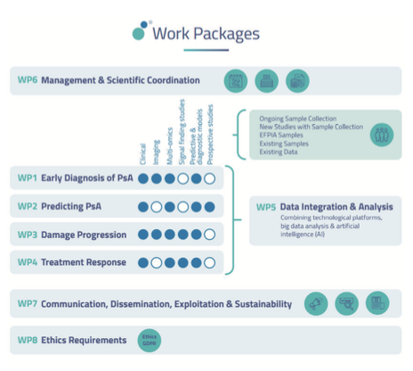 HIPPOCRATES is structured into eight work packages, which focus on different goals (see Figure 1). These include the identification of specific PsA disease markers which might aid early diagnosis, the prediction of which person with psoriasis will develop PsA, the monitoring and prevention of PsA disease progression, and the identification of personalised treatment options – finding what medication works best for which person. To facilitate this work- plan, the HIPPOCRATES consortium partners are sharing data and samples from previously-conducted studies on psoriasis and PsA populations for extensive omics-based analysis and to establish and validate robust biomarkers across datasets.