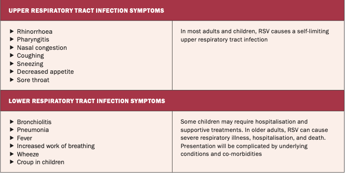 Once the virus comes in contact with the mucosa of the eyes, nose, or mouth, it infects the epithelial cells of the upper and lower airways.2 The initial symptoms of RSV can be similar to a cold, and depending on the severity of the infection, the infected individual can develop symptoms such as a cough, wheeze, rhinorrhoea, fever, and sore throat (see Table 1).9