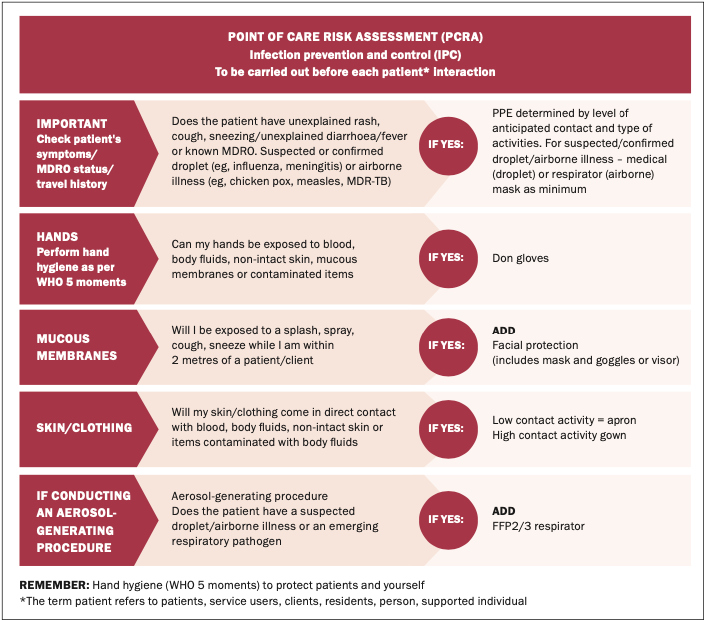 Appropriate use of personal protective equipment (PPE) including the use of masks, gloves, and apron. As always, a risk assessment is advised, with the choice of PPE dependent on a number of factors, including the patient care task involved. Nurses and other healthcare workers are directed to carry out a point-of-care risk assessment (PCRA) prior to patient contact (Figure 1).19