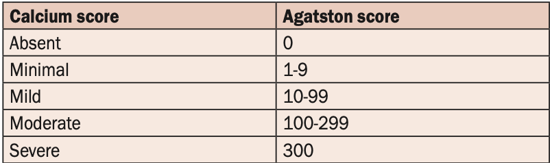 CAC score is presented using the Agatston unit, a validated scoring system for CAC using 3mm CT slices. The results are presented as a number which can then be graded from absent to severe (see Table 1). The score is also converted to a percentile based on the patient’s age, gender, and ethnicity to see how they compare to their peers. A normal CAC score or CAC score of zero is an excellent prognostic indicator with low-risk of CVD out to 12 years of follow-up in one large study.3 Overall, plaque burden as assessed by CAC has been shown to be more predictive of events than degree of stenosis identified on CTCA, highlighting the value of this non-contrast study.4