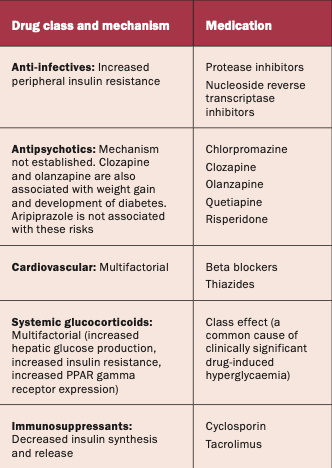 Certain drugs impair glucose tolerance through reducing insulin secretion, increasing hepatic glucose production, or causing insulin resistance (Table 1). Where appropriate, patients should be informed about these risks (especially with prolonged steroid use), as with all clinically-relevant side-effects.