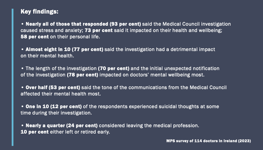 New research from MPS supports our concerns about the impact of Medical Council investigations on the mental health doctors. In a survey of 114 doctors who have been investigated by the Medical Council in the last five years, nearly all of those who responded (93 per cent) said that the investigation caused stress and anxiety and 77 per cent said the investigation had a detrimental impact on their mental health. Of the respondents, 70 per cent said that the length of the investigation impacted their mental health the most and 53 per cent said that the tone of communications from the Medical Council affected them most.