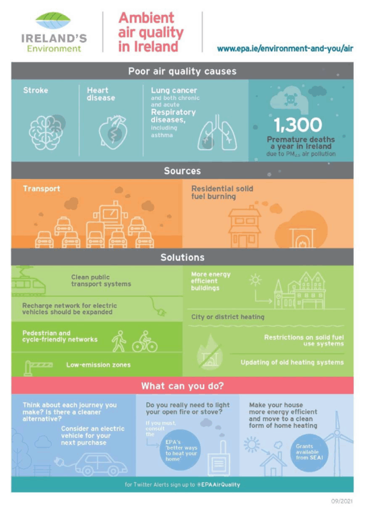 Air pollution is the leading cause of premature death worldwide. Over seven million people die each year because of the air they breathe. There is no safe level of long-term exposure to poor air quality and particulate matter. Worldwide, nine out of every 10 people breathe air that contains levels of pollutants that exceed WHO guidelines. In industrialised countries, air pollution is mainly caused by the use of non-renewable energy sources in factories and the burning of fossil fuels to drive transport. The Environmental Protection Agency in Ireland estimates that approximately 1,300 people die prematurely each year as a result of air pollution (Figure 3). The dramatic rise in car ownership over the past 50 years is the main contributor to poor air quality in Ireland, with almost 2.5 million cars on Irish roads burning fossil fuels.