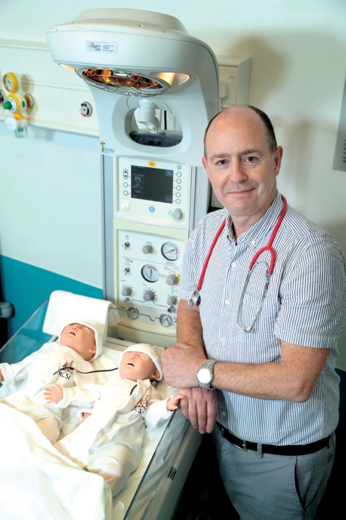 Pictured is Professor Jonathan Hourihane who has been appointed as Professor of Paediatrics at RCSI where he will further drive his clinical and research interest in paediatric food allergy and anaphylaxis. He is pictured with newborn simulators in the National Surgical and Clinical Skills Centre at RCSI.