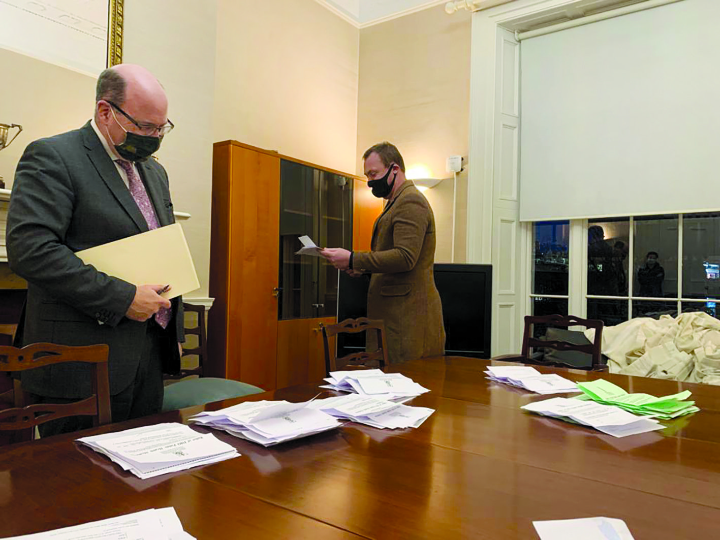 Pictured is Mr John O’Connor, Independent Adjudicator and solicitor (left) and Mr Val Moran, IMO Director of Industrial Relations, General Practice, Public and Community Health (right), at the counting of the ballots in IMO headquarters in Fitzwilliam Place, Dublin.