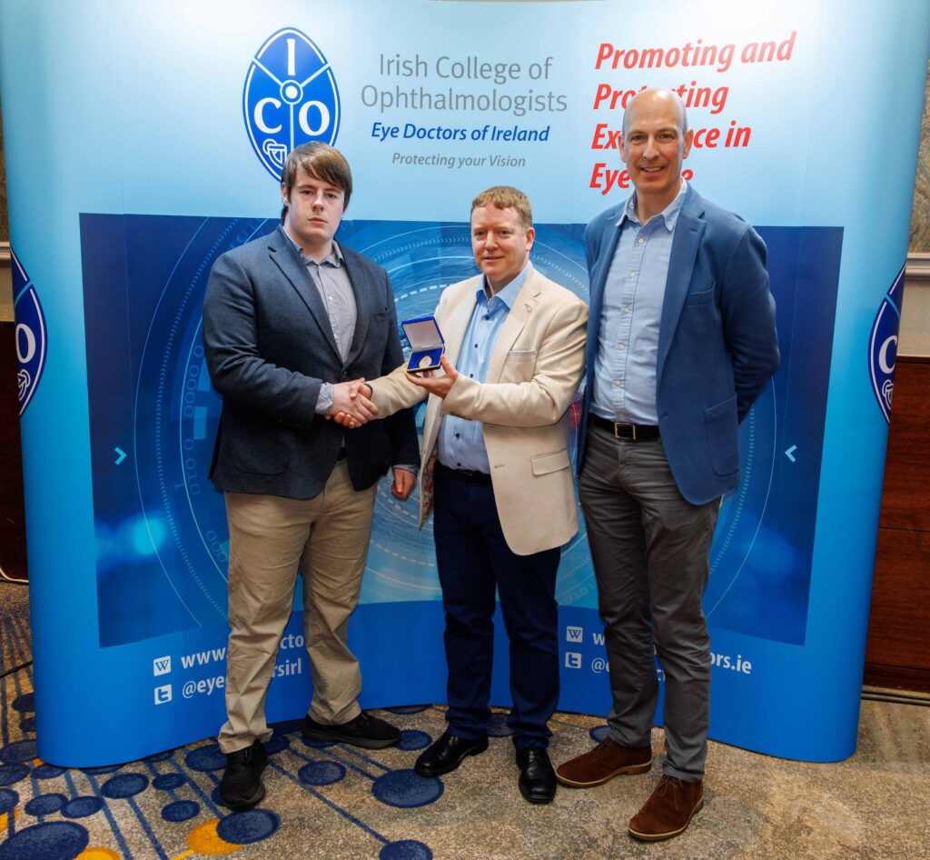 Keynote speaker Mr Felipe Dhawahir-Scala (centre), Consultant Ophthalmic and Vitreoretinal Surgeon and Director of the Acute Ophthalmic Services, Manchester Royal Eye Hospital is pictured with Ms Janice Brady, Consultant Ophthalmic Surgeon at University Hospital Waterford and Mr John Doris, ICO President at the Irish College of Ophthalmologists Annual Conference 2025 (21st – 23rd May) at Kilkenny Convention Centre, Lyrath Estate, Co Kilkenny. Mr Dhawahir-Scala gave a talk on The British Emergency Eye Care Society : The New Era of Emergency Ophthalmology to delegates at the annual scientific conference, where over 250 eye specialists were in attendance at the 3-day meeting. Christopher Sweeney, School of Medicine, University College Cork, recipient of the Sir William Wilde Medal for the Best Poster presentation; Mr John Doris and Prof Conor Murphy, Chair of the ICO Scientific Committee