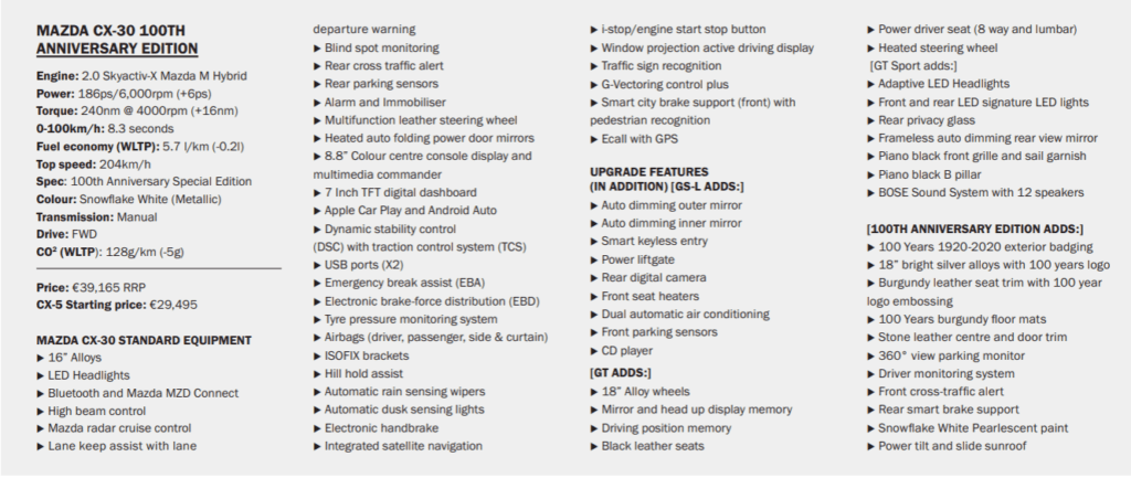 Mazda’s 100th anniversary edition CX-30 crossover was festooned with commemorative markings to celebrate the marque’s century in the business. My test car had a lovelyburgundy interior with the aforementioned ‘1920-2020’ markings in the headrests. There were also ‘100 years’ logos on the 18” bright silver alloy wheels and the f loor mats. As it’s a special edition, Mazda threw the kitchen sink at the car’s spec list, with the Bose sound system, 360 view cameras, and driver monitoring system, to name just a few. Mazda are keen to shine a light on more than just
