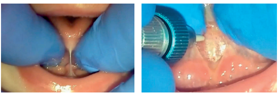 Frenuloplasty (see Images 2a-d) is a procedure that involves releasing the tongue frenulum and placing absorbable stitches and glue to help control the healing. Local anaesthetic is used to ensure this is pain-free. Children and older infants would have the procedure under conscious sedation, so they are relaxed, but still have normal tone in their tongue. Adolescents and adults do not need sedation just the local anaesthetic.