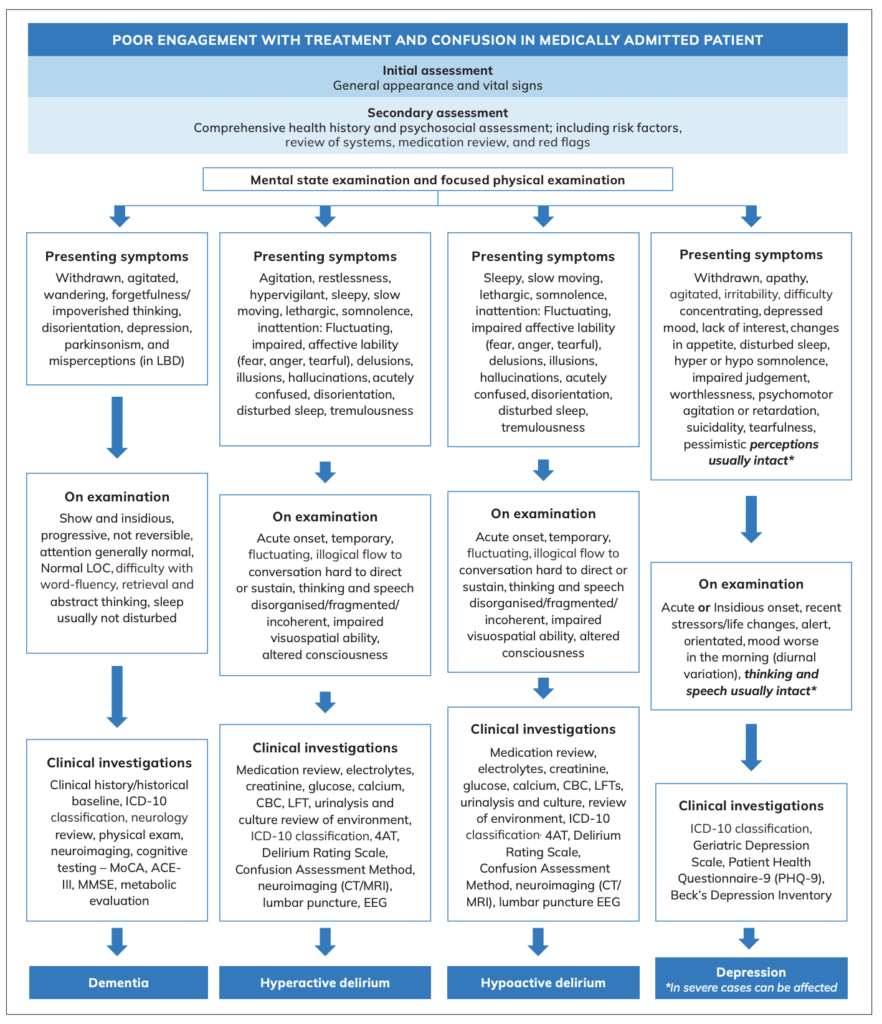 Algorithms can assist practitioners in the development of a valid approach in differential diagnosis by indicating, in a structured manner, frequently encountered decisions in the diagnostic reasoning pathway. These are especially helpful when presentations have overlapping or similar symptomatology, as is the case for dementia, delirium, and depression.