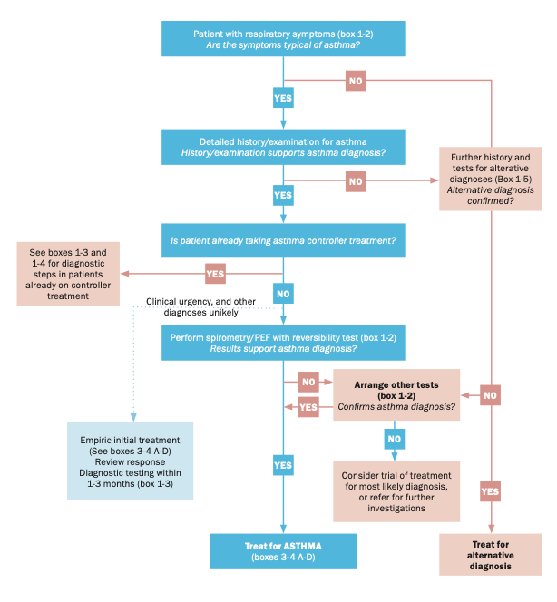 The GINA diagnostic flowchart (Figure 1) can guide the diagnosis of asthma in patients presenting with symptoms. Other evidence of atopy, such as rhinitis, eczema, and an elevated eosinophil count, increase the likelihood of asthma; however, blood eosinophil count does not define asthma, but rather contributes to phenotyping. Sputum eosinophilia is generally more accurate, but is not routinely available in primary care.