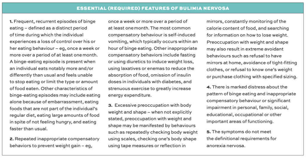 It is important to note that this list is not exhaustive, and gives only a guide to some of the medical presentations that might raise the index of suspicion that you are seeing a presentation of bulimia nervosa. For a more comprehensive and in-depth guide to potential medical risk and complications, and management of same, please refer to resources such as Medical Emergencies in Eating Disorders: Guidance on Recognition and Management and Medical Management of Eating Disorders.7,8