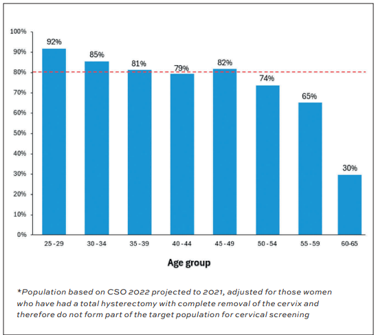 However, coverage declines with age in Ireland. Participation among women aged 60 and above drops significantly, with the lowest uptake – around 30 per cent – seen in those aged 60-65 years. Various programme strategies to address this included a focus on older women in 2023 when women who had exited the cytology programme were offered a once-off HPV test. Additional education targeting post-menopausal women and sample-takers focused on making screening more comfortable and removing barriers to participation.