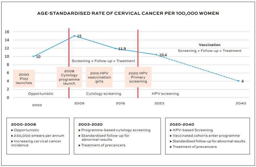Ireland is on track to eliminate cervical cancer by 2040. The WHO defines elimination of cervical cancer as reaching an incidence lower than four cases per 100,000 women, making cervical cancer a rare disease and eliminating it as a public health problem. Ireland’s incidence rate is now 10.1 per 100,000 women. This bold but achievable target is grounded in a cohesive, evidence-informed strategy that combines HPV vaccination, primary HPV screening, effective early treatment, and a strong commitment to equity and public trust.