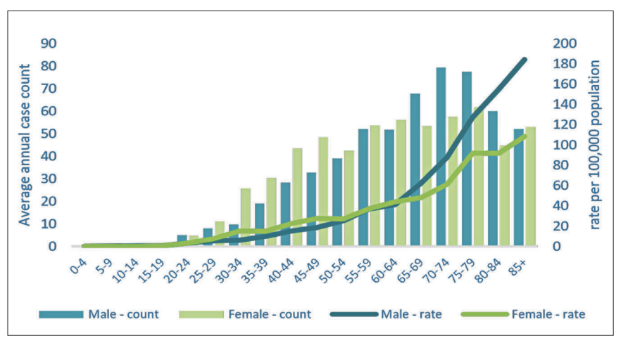 Year-on-year the numbers of melanomas diagnosed in Ireland have increased in both men and women, as per the below graph from the NCRI (Figure 1). The distribution of melanomas diagnosed in Ireland shows higher rates in the southeast and south of the country, which mirrors the situation in the UK.