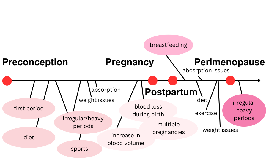 Iron plays a vital role in women’s health across the various life stages. From adolescence, for growth and development, to the reproductive years, ensuring adequate iron levels to compensate for menstrual loss. Meeting iron needs during pregnancy becomes even more important for both the mother and the developing foetus. During perimenopause, menopause, and post-menopause stages, maintaining optimal iron levels supports overall health as the woman’s body undergoes significant hormonal and physiological changes. Understanding the importance of iron across these life stages allows for proactive management, emphasising the importance of diet and nutrition, supplementation when necessary, and regular health monitoring to promote lifelong wellness in women.