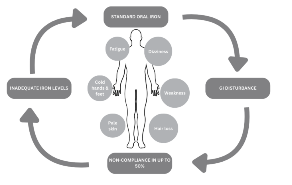 Iron deficiency is one of the most prevalent nutritional deficiencies worldwide, affecting a substantial number of women, particularly during key life stages marked by increased physiological demands. Iron deficiency is the most common cause of anaemia worldwide and affects approximately one billion people. Iron deficiency anaemia (IDA) is a major cause of morbidity and burden of disease, being associated with chronic kidney disease, chronic heart failure, cancer, and inflammatory bowel disease (IBD) among other issues. 2 It is a leading cause of long-term health disability in women.3