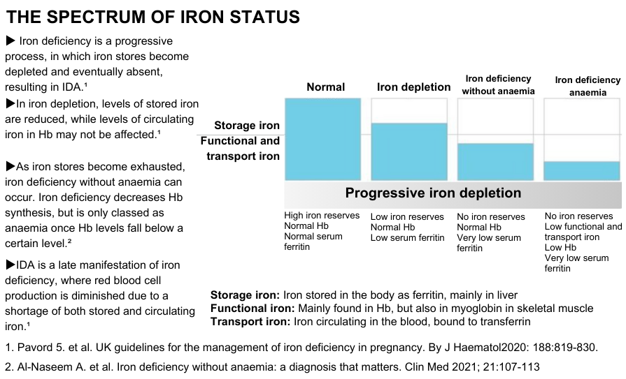 Risks of iron deficiency: Insufficient iron intake during pregnancy can lead to IDA, posing risks such as preterm birth, low birth weight, and developmental delays in the infant. Maternal complications like fatigue, weakness, and increased susceptibility to infections are also associated with iron deficiency.14 Pregnancy anaemia can be asymptomatic and may be diagnosed following routine screening. Signs of anaemia can occur in the absence of a low Hb, diagnosed by an FBC with a reduced MCV and MCHC. If the ferritin level is <30ug/l, then iron therapy should be commenced.21
