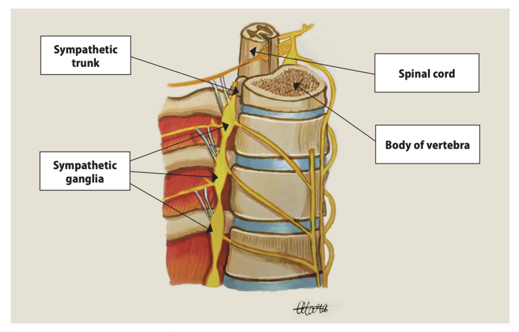 FIGURE 1: Anatomical location of thoracic sympathetic chain and ganglia
