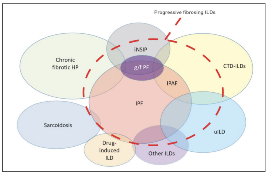 FIGURE 1: Schematic representation of types of ILD that may be associated with a progressive fibrosing phenotype. Connective tissue disease (CTD)-ILDs include rheumatoid arthritis-associated ILD, systemic sclerosis-associated ILD, mixed CTD-associated ILD, and other autoimmune ILDs. Other ILDs include exposure-related ILDs (asbestosis and silicosis), non-idiopathic pulmonary fibrosis, idiopathic interstitial pneumonias (desquamative interstitial pneumonia, etc), and others. (Abbreviations: G/f PF: Genetic and/ or familial pulmonary fibrosis; HP: Hypersensitivity pneumonitis; iNSIP: Idiopathic nonspecific interstitial pneumonia; IPAF: Interstitial pneumonia with autoimmune features; uILD: Unclassifiable ILD Reproduced with permission of the ©ERS 2024: European Respiratory Review 28 (153) 190109; DOI: 10.1183/16000617.0109-2019. Published 1 October 2019