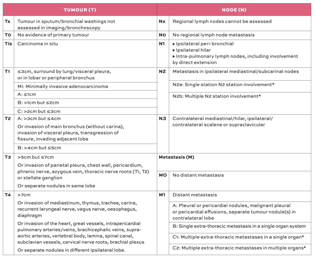 With the advent of immunotherapy and targeted therapies, the lung cancer treatment paradigm is shifting, and the importance of accurate staging in lung cancer remains paramount. This article seeks to outline the recent changes in the new 9th edition of the tumour-node-metastasis (TNM) staging system, addressing what potential impact it may have on future management and what the 10th edition of the staging system may hold.1