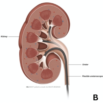 More invasive surgical approaches are usually done by the minimally-invasive endoscopic approach known as ureteroscopy. This involves passing a semi-rigid or flexible scope via the urethra to the ureter and renal pelvis. Through this scope a laser and other instruments can be passed, which allows destruction and extraction of stones (Figure 3B & 4). This can usually be done as a day case procedure under general anaesthesia and is suitable for most stone types.