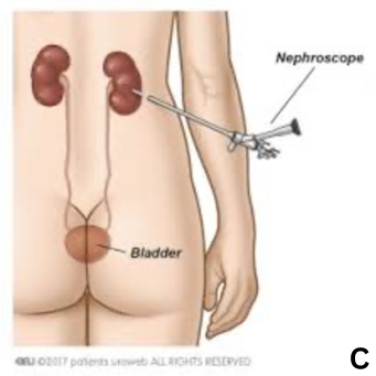 For larger stones, or those in difficult to access calyces, percutaneous nephrolithotomy (PCNL) may be advised (Figure 3C). During PCNL a tract is created via the patient’s flank to allow passage of a scope directly into the kidney. Both PCNL and ureteroscopy are considered safe and effective procedures for the management of stones with excellent outcomes. In the era of minimally-invasive endourology the need for open surgery for the management of intra-renal stones has become rare.