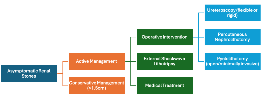 For asymptomatic intra-renal stones, like the one in our case presentation, the management options are conservative treatment, medical treatment, or active removal (Figure 2). The decision on which management approach to be taken is a collaborative one between patient and clinician following discussion of all management options, the benefits, and the risks.