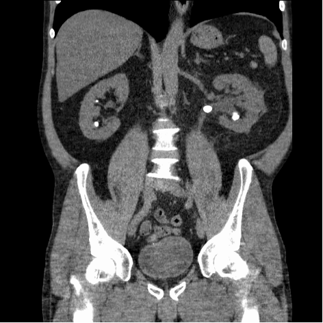 History: The patient reported no history of flank pain, haematuria, dysuria, or other lower urinary tract symptoms. He had never passed a kidney stone, or had a urinary tract infection. He underwent ultrasound abdomen due to intermittent biliary colic, for which he was awaiting follow-up with general surgeons. His past medical history is significant for reflux, for which he takes a proton-pump inhibitor, and a previous arthroscopy for knee pain. He is a non-smoker with an estimated alcohol intake of 14 units per week. He is an office worker, who goes to the gym twice a week, and plays tennis once weekly. He lives with his partner and two children. He has no family history of stone disease or nephrological illness. He drinks two coffees per day, has a carbonated drink with lunch, and ‘tries’ to drink a litre of water per day. He maintains that he follows a relatively healthy diet and his family get take-away once per week.